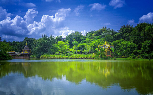 西双版纳原始森林公园,位于景洪以东、澜沧江以北,距州府所在地8公里处,是全州离景洪城最近的一片原始森林。该园是在25000亩热带沟谷雨林的基础上创建,园内森林覆盖率超过98%,是个天然的大氧吧。园内有沟谷雨林、孔雀飞舞、民俗歌舞、美食、泼水狂欢等项目,是西双版纳最大的综合性生态旅游景点之一。