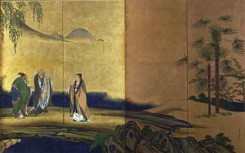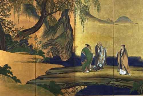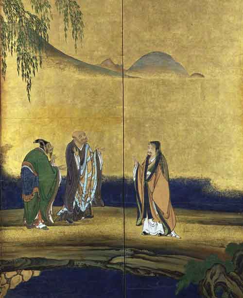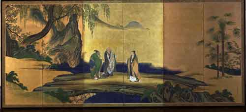 此事后来成为佛教和文坛的千古佳话,虎溪亦因此更为著名。千百年来有关《虎溪三笑》图不计其数,诗人品咏作品则更多,吟咏不疲。李白、苏轼等都有题咏。随着净土宗在日本的普及,“虎溪三笑”也为日本文人所喜爱。在日本关于“虎溪三笑图”的绘画作品甚至比中国还要多,世界许多著名博物馆都有收藏,这里与您分享的是十七世纪桃山时代日本著名绘画大师--狩野山乐的六曲屏风画《虎溪三笑图》。